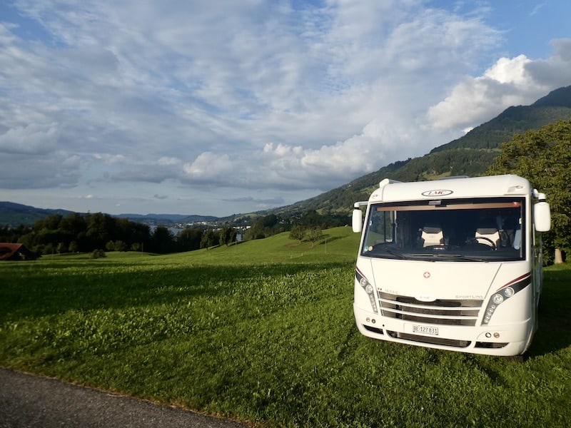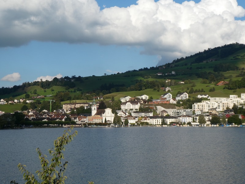 Durch Weggis hindurch führt unser Weg bergwärts zu einem Bauernhof, der seit diesem Jahr einige Stellplätze an traumhafter Lage (für 20 Franken/Nacht) anbietet. Wir geniessen die Sicht auf Küssnacht und einen Teil des Vierwaldstätter Sees.