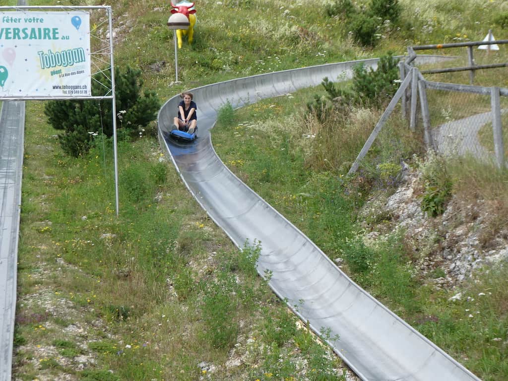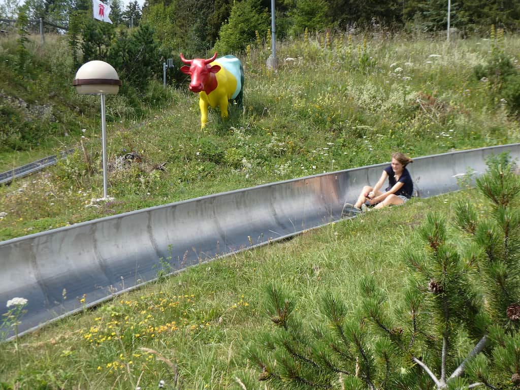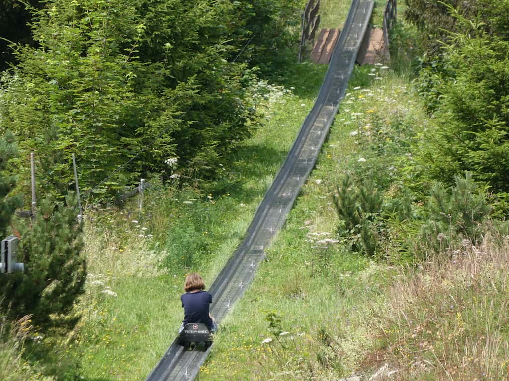 Während Renate das Mittagessen vorbereitet, rodelt Alina ein paar Mal die 700 Meter lange Bahn hinunter. Jedes Mal steigert sie das Tempo und hat sichtlich Spass daran. Wir haben Glück mit dem Wetter, den ganzen Tag ziehen Gewitterwolken über uns hinweg, aber wir werden verschont.