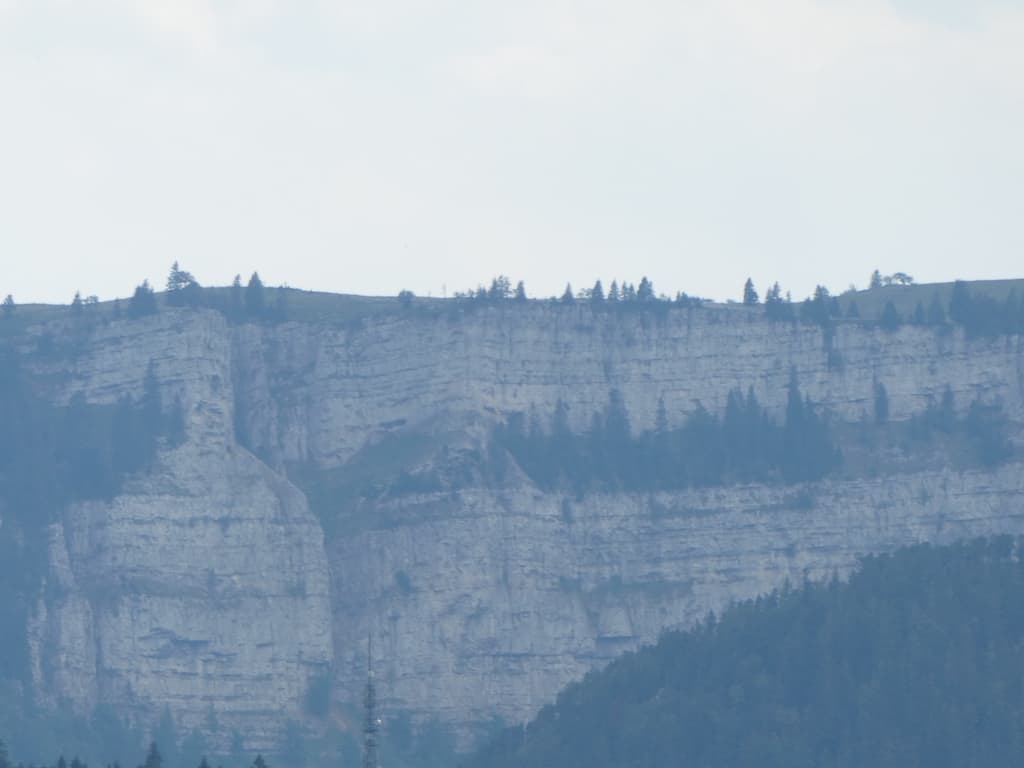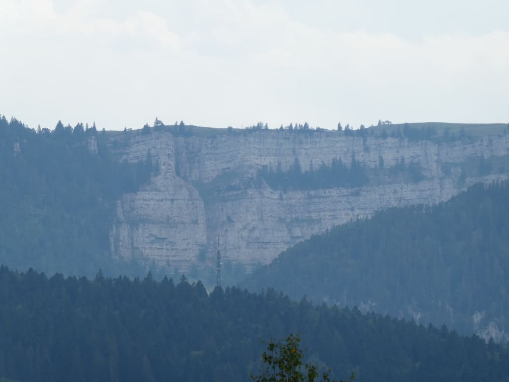 Von hier sieht man ganz in der Ferne den Felsenkessel des Creux du Van.