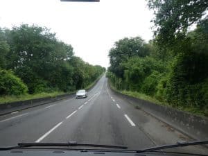 Wie so oft in Frankreich geht es auch hier auf der N165 – wie auf einer Achterbahn – in eine Senke und auf der anderen Seite wieder steil bergauf.