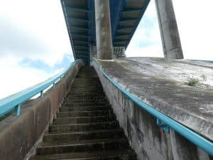 Von unten führen auf beiden Seiten Treppen hinauf . . .