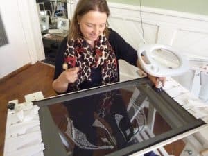 Wir schauen zu wie Saskia ter Welle Perlen und Silberdraht zu Ornamenten verarbeitet.