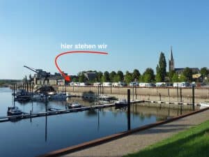 Der Blick auf den Touristenhafen. Ganz da hinten stehen die Reisemobile. Der Wasserstand der IJssel schwankt sehr. Im Januar stand das Wasser hier sogar 5 Meter höher.
