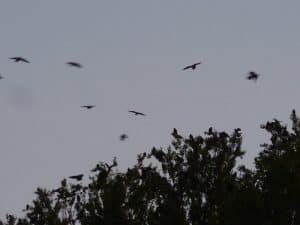 Beim Einnachten suchen sich hunderte Krähen kreischend ihr Nachlager in den Bäumen hinter dem Hafen.