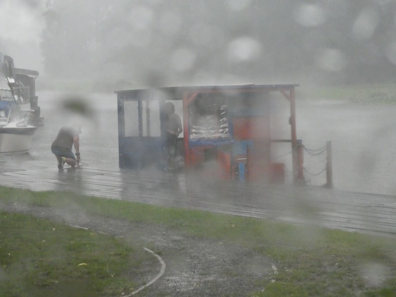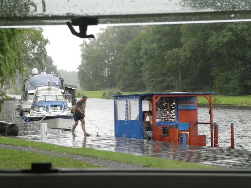 Im grössten Regen kam so ein schwimmendes Gartenhaus, wie sie hier in der Region vermietet werden, zum Anlegen.