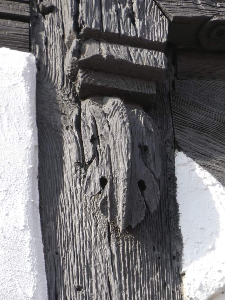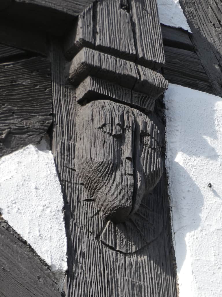 Die «Alte Farb». Als Herrenhaus 1617 errichtet, wohnte in diesem Gebäude ein Leinenfärber. Im Zierfachwerk unter dem Erker und dem Giebel ein Neidkopf und ein Widder.