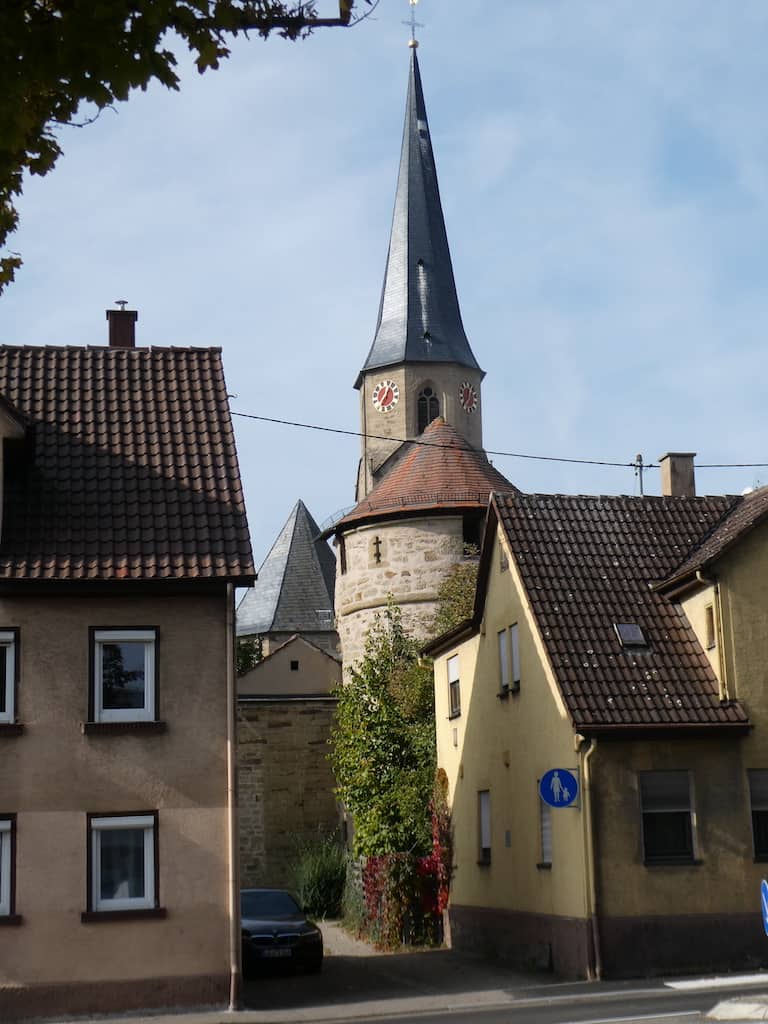 Die Cyriakuskirche von 1350 aus der Ferne. Das Innere der dreiteiligen Säulenbasilika zu besichtigen blieb uns verwehrt. Sie ist geschlossen, wie die meisten der evangelischen Kirchen.