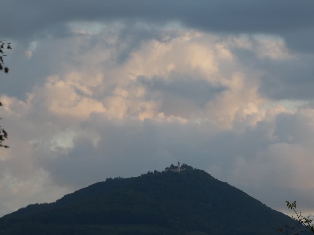Auf der Weiterfahrt ist in der Ferne die Burg Teck zu erkennen. Rasch wird es dunkel. Sonne und Wolken erzeugen nochmals eine grandiose Stimmung.