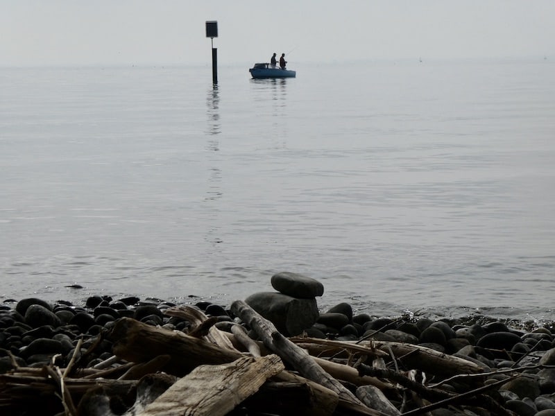 Durch den Nebel hört die Welt hinter den Anglern auf. Enorm viel Schwemmholz liegt hier am Ufer. Die Wellen eines Motorbootes entwickeln eine richtige Brandung.