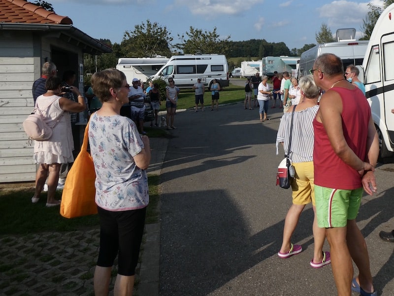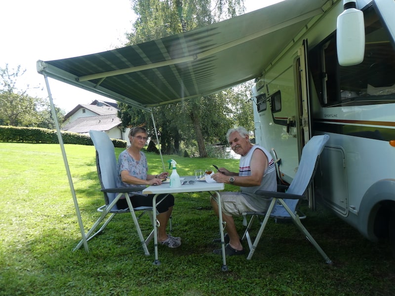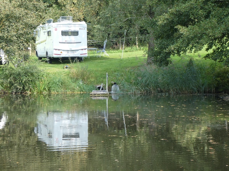 Aber oh Schreck, der Platz ist fast voll und die wenigen freien Plätze sind schon alle reserviert. Aber Anton, der Betreiber, weiss Rat und gibt uns einen Ausweichplatz auf seiner Wiese beim Weiher. Drei andere Camper stehen auch schon da. Hier finden wir es noch viel schöner als auf den regulären Stellplätzen. Anton legt sogar noch eine Kabelrolle aus, womit wir auch hier alle Strom haben.