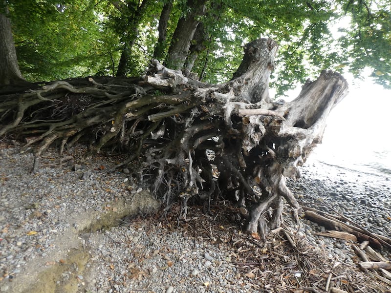 Riesige Wurzelstöcke von umgestürzten Bäumen liegen am Ufer.