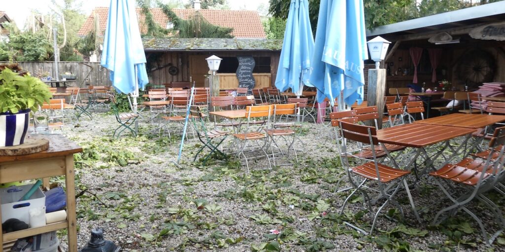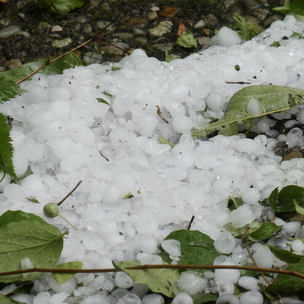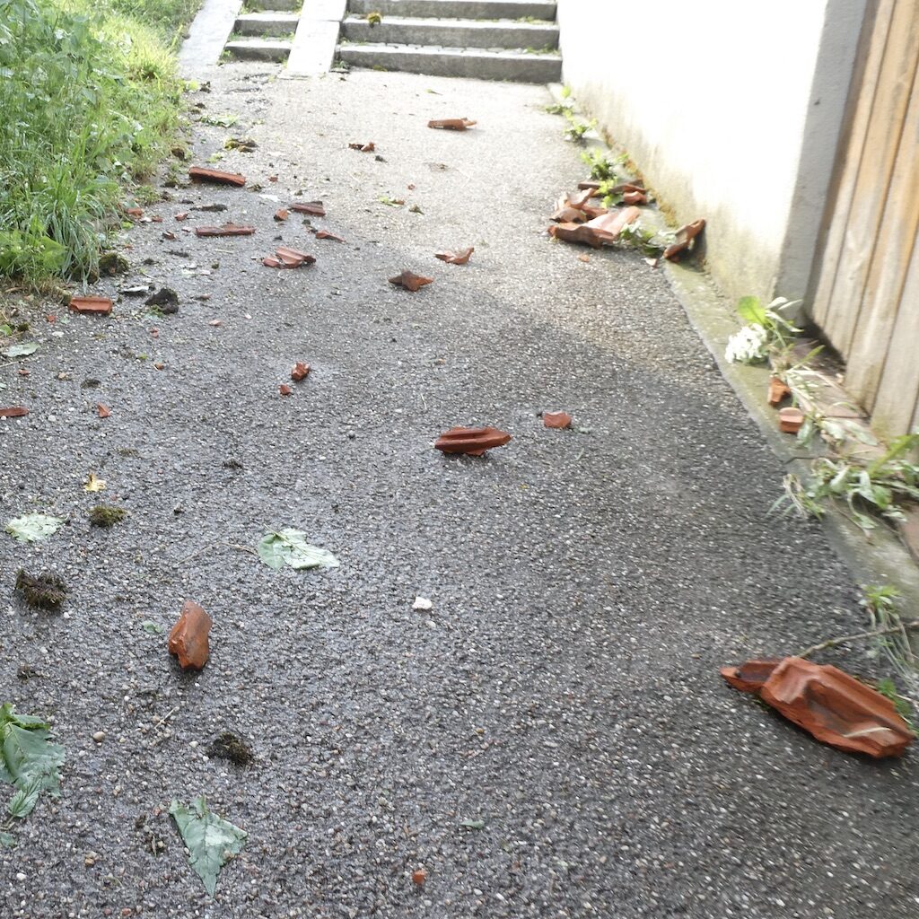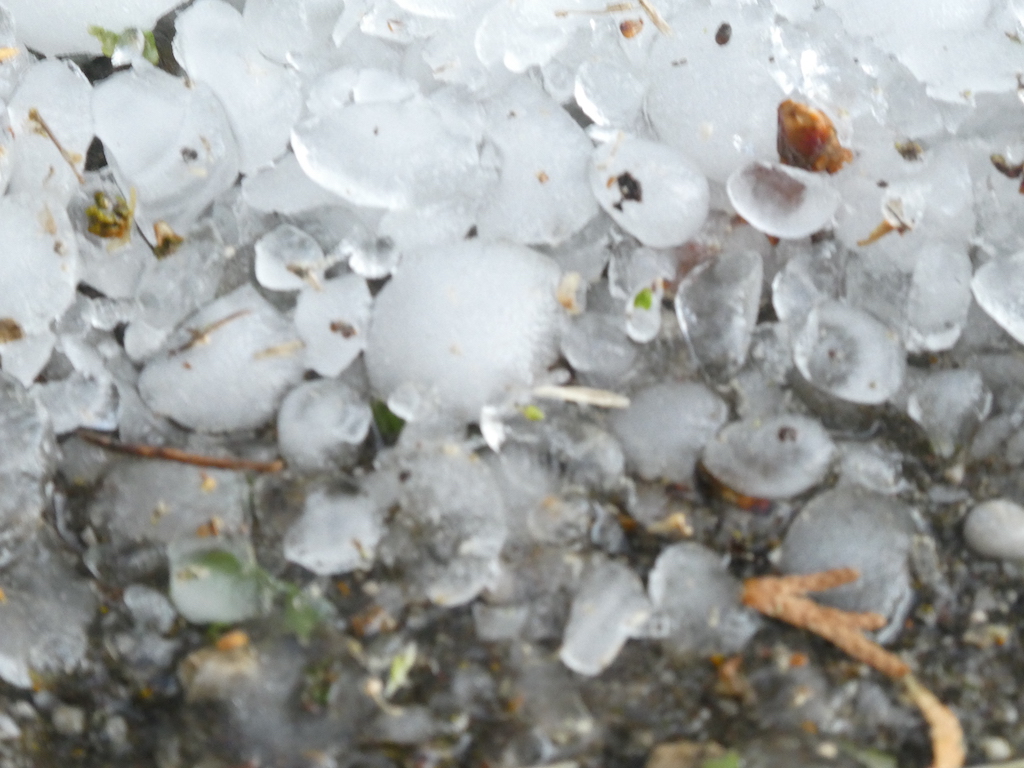 Erst als wir zum nahen Restaurant gehen, sehen wir das Ausmass der Verwüstung. Haufenweise Hagel, Blätter und zerbrochene Dachziegel am Boden.