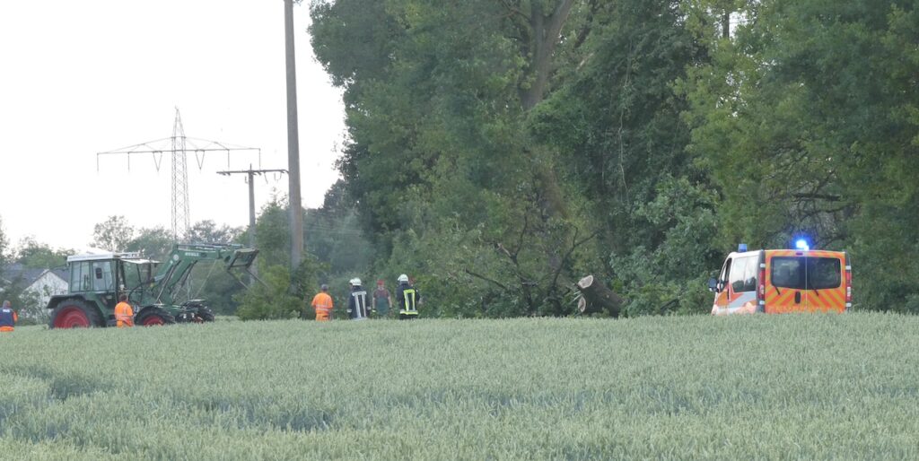 Auch die Feuerwehr ist mit schwerem Gerät dabei, die Schäden an der Stromleitung durch umgestürzte Bäume zu beheben.