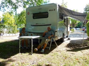 Wir installieren uns auf dem Stellplatz von Meppen und geniessen erst einmal das Rasenplätzchen unter den Bäumen.