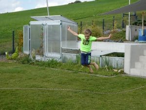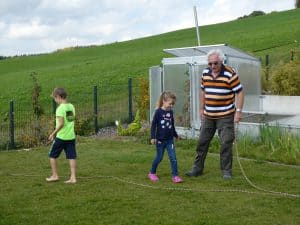 Nach dem Essen muss Michael beim Seilspringen mitspielen.