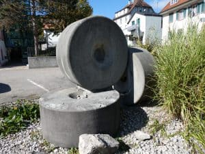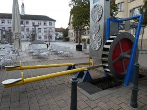 In der Hauptstrasse stehen mehrere solche Wasserräder, mit denen lustige Spielgeräte angetrieben werden.