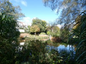 Dahinter liegt idyllisch der Teich.