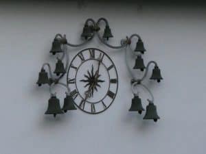 Die Rückseite ziert eine Uhr mit einem Glockenspiel, das zur vollen Stunde eine hübsche Melodie spielt, sowie die Viertelstunden schlägt.