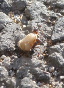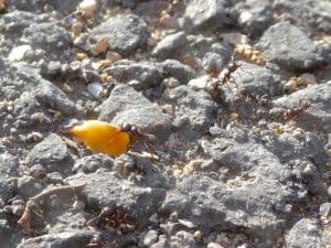 Ameisen haben sogleich bemerkt, dass es Körner zu ergattern gibt, die beim Brotschneiden auf den Boden fielen.