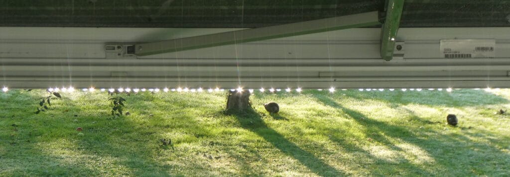 Sonntag: Wie Perlen hängt der Morgentau am Frontprofil unserer Markise.