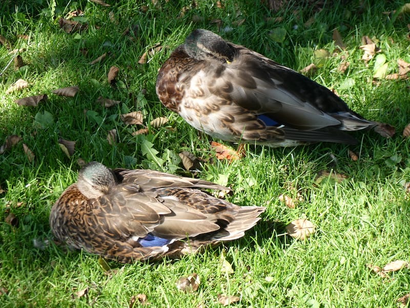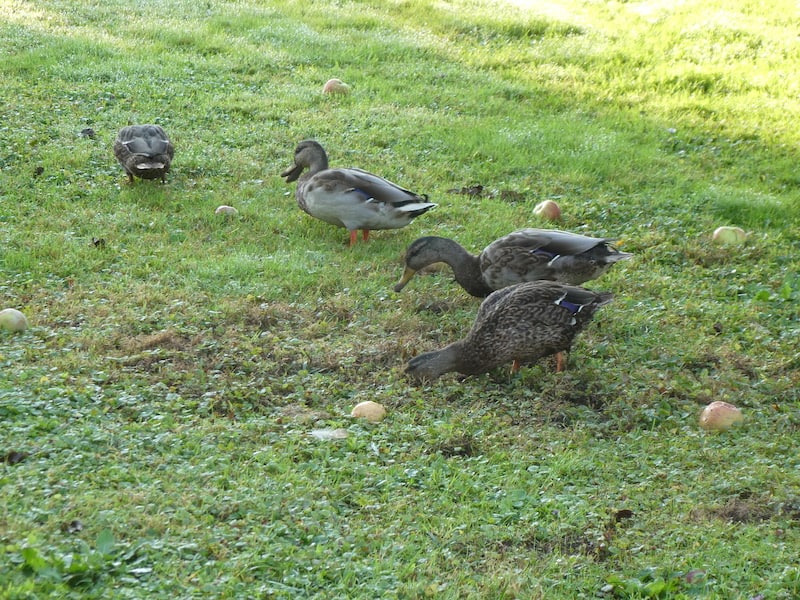 Wir frühstücken unsere Äpfel vom Teller. Die Enten von der Wiese.