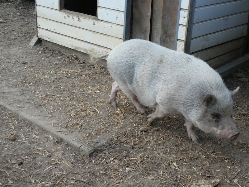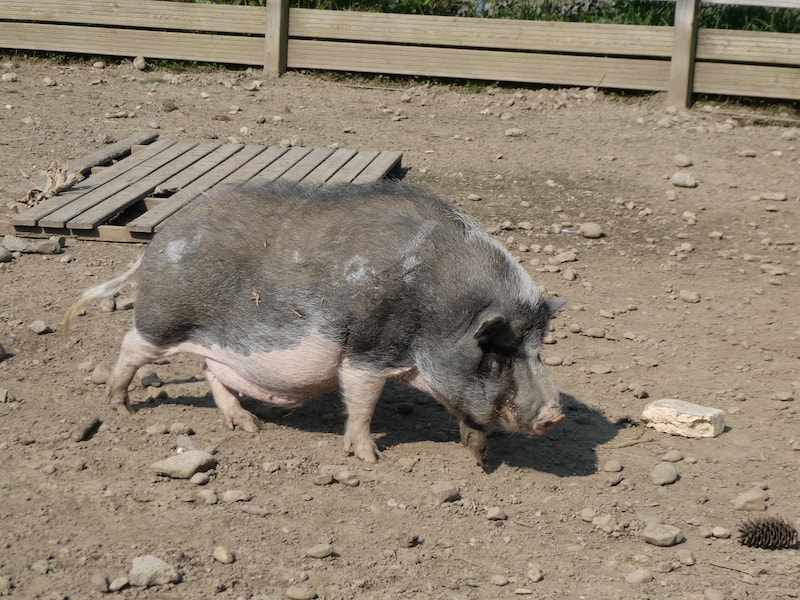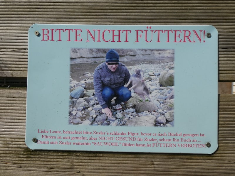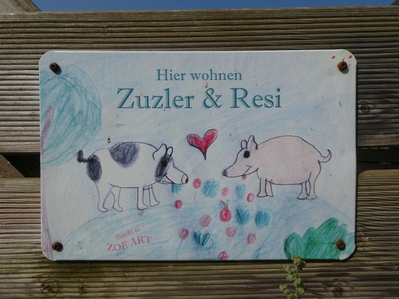 Im ehemaligen Bauernhof leben Zuzle, die gefleckte Sau und Rosi, die unbefleckte. Sie sind sehr verfressen, betteln jeden an und sind auch entsprechend gut genährt.