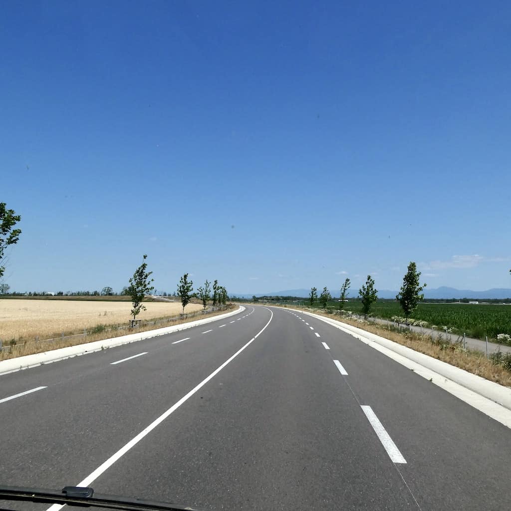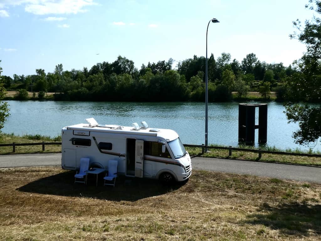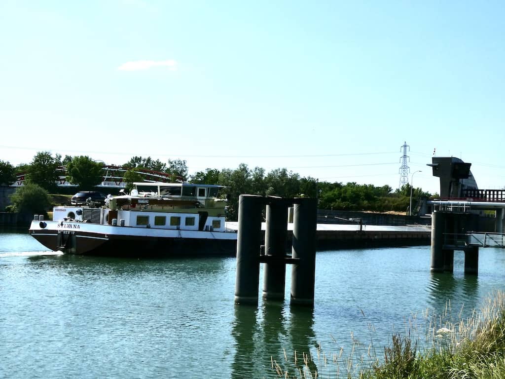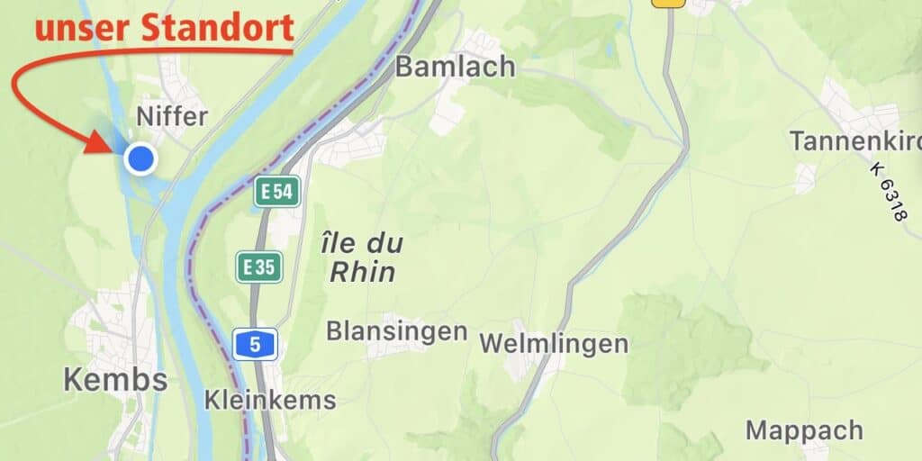 Hier am Rhein, bzw, dem Kanal, kommt man kilometerweit nicht ans Wasser. Nebst dem Atomkraftwerk Fessenheim (inzwischen ausser Betrieb) gibt es hier viel Industrie. Das Wasser sehen wir nur auf dem Navi-Bildschirm.