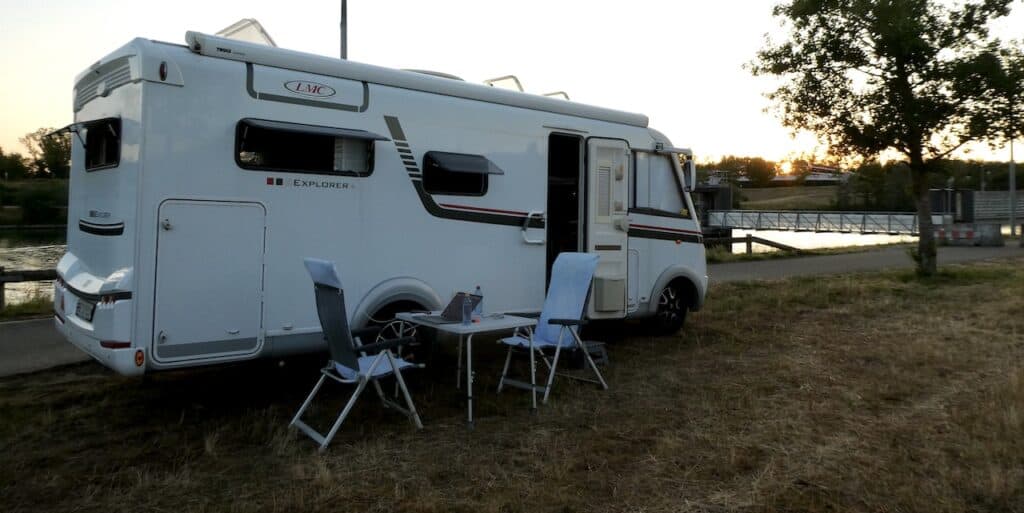 Es weht auch ein kleines Lüftchen und macht die Hitze erträglicher. Sogar ein Lastschiff fährt in die Schleuse. Wir stehen hier (ungeplant) wieder wild, diesmal aber nicht alleine. Es sind auch noch andere Camper in der Umgebung.