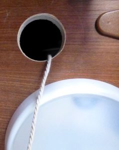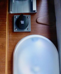 Ein Loch im Durchmesser der Steckdose ist schnell gebohrt. Das Stromkabel verläuft ohne Hindernisse unter der Hecksitzgruppe hindurch zum 12-Volt Stromverteiler im Kleiderschrank auf der linken Seite.