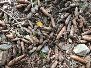 Teilweise liegen viele Tannenzapfen auf dem Boden und wir müssen aufpassen, dass wir nicht wieder zurückrollen.