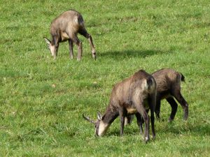 Auf unserer Weiterfahrt entdecken wir auf einer Wiese ein Rudel Gämsen.