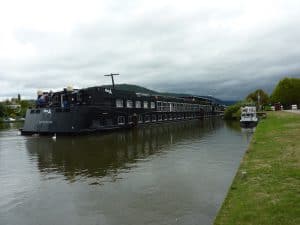 Inzwischen hat ein holländisches Hotelschiff angelegt. Ein hässlicher schwarzer Pott.