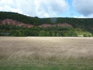 Hier sehen wir einen Steinbruch, aus dem der so beliebte rote Sandstein kommt.