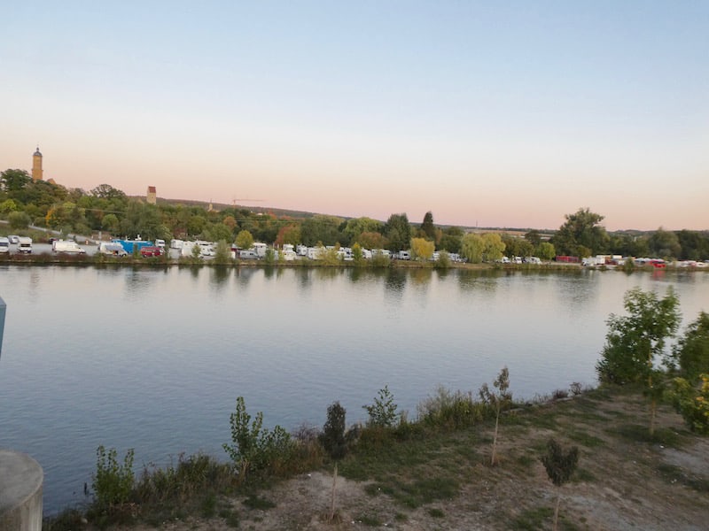 Abends spazieren wir noch über die Brücke auf die andere Mainseite und werfen einen Blick auf den Stellplatz. Es stehen wieder ähnlich viele hier wie gestern.