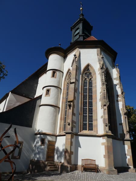 Später laufen wir zur Wallfahrtskapelle „Maria im Weingarten“, die etwa 2 km ausserhalb in einem Weinberg steht. Die letzten 400 Meter gehen bergauf und so wird dies auch für Protestanten, wie wir es sind, ein Pilgerweg.