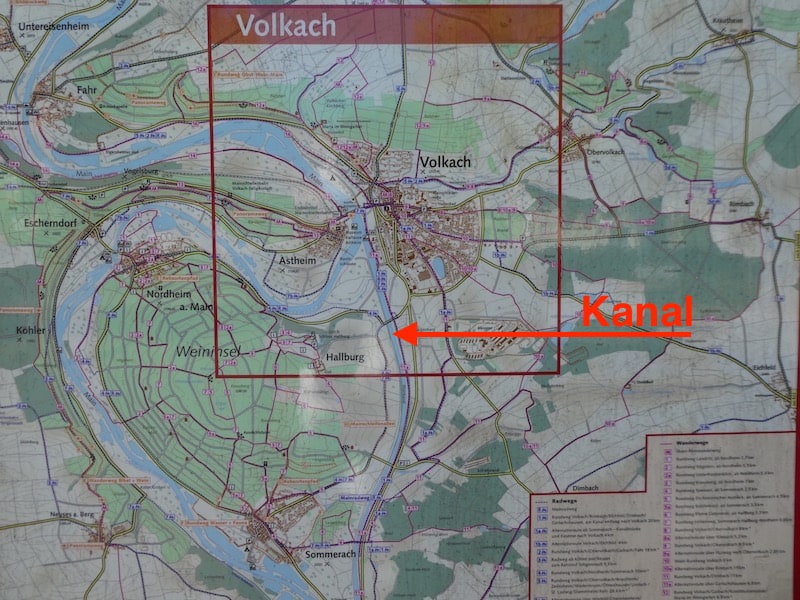 Der Main macht hier einige wilde Schleifen. Durch ein Stück Kanal kann die Schifffahrt 6 km abkürzen.