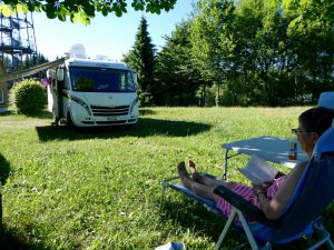 Beim Berghotel „Drei Brüder Höhe“, Marienberg, gibt es einen wunderbar ruhig gelegenen Stellplatz. Wir geniessen den Rest des Tages im Schatten. Abends gibt es Fleisch vom Grill, Salat und Rotwein. Es geht uns gut.