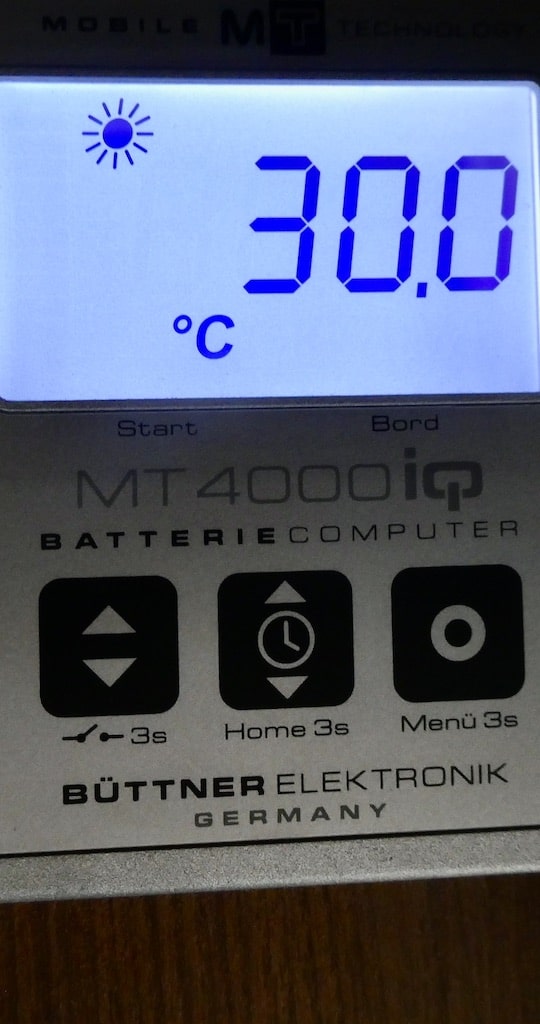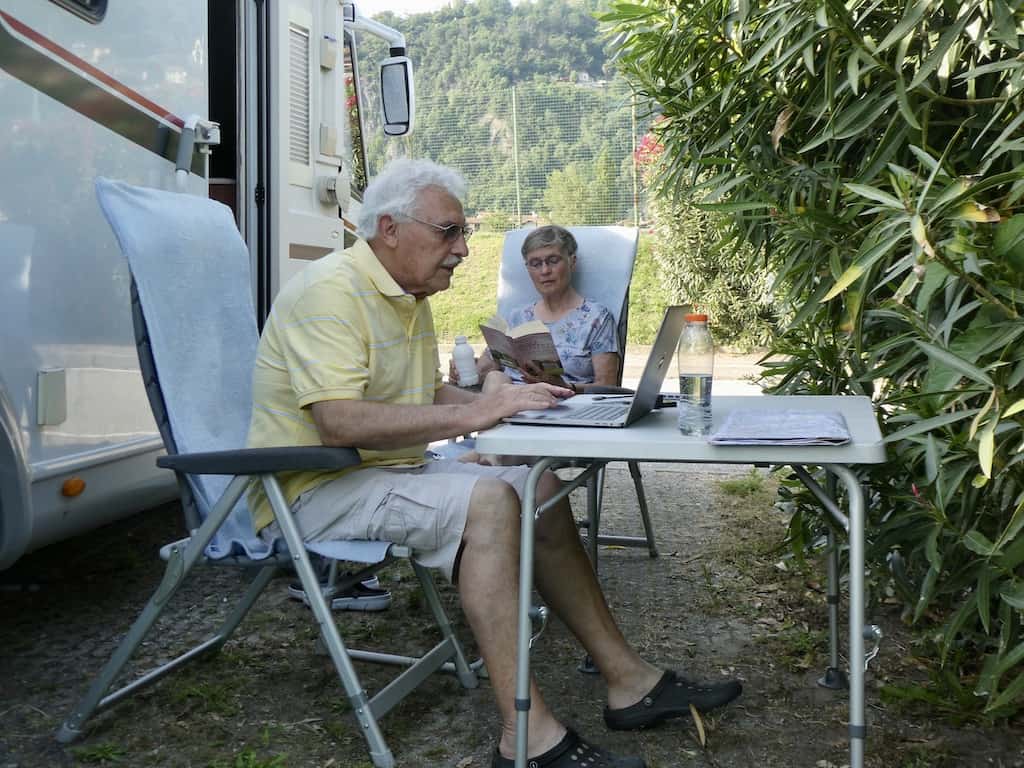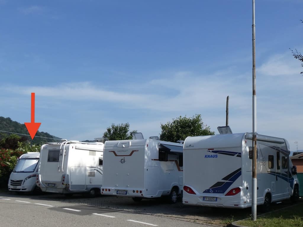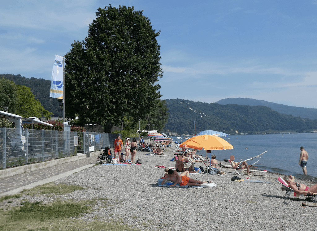 In Maccagno, kurz nach Luino, weist unser Führer einen Stellplatz für eigentlich 10 Fahrzeuge aus. Etwas mehr haben wohl Platz, aber mit den heute 29 Campern ist er übervoll. Allerdings haben wir Glück. Auf dem Ausweichplatz vis-a-vis ergattern wir gerade noch die letzte Lücke. Hier stehen wir sogar besser als auf dem offiziellen Platz. Inzwischen zeigt das Thermometer 35° im Schatten (der Fühler ist unter dem Fahrzeug).