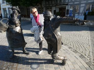 Beim Narrenbrunnen von Gero Hellmuth fragt Renate nach dem Weg.