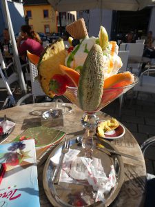 Auch wir lassen uns von solchen hier angebotenen üppigen Kreationen verführen. Allerdings bleiben wir bescheiden bei je 2 Kugeln Eis.