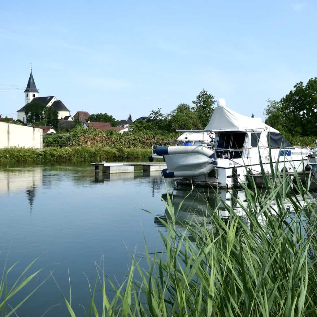 Dann schauen wir uns auf der Durchfahrt noch den Freizeithafen in Kembs an. Es könnten ja Bekannte mit ihrem Boot hier liegen. Dies ist aber nicht der Fall. Das grosse alte Frachtschiff an Land dient wohl als Capitainerie und Restaurant.