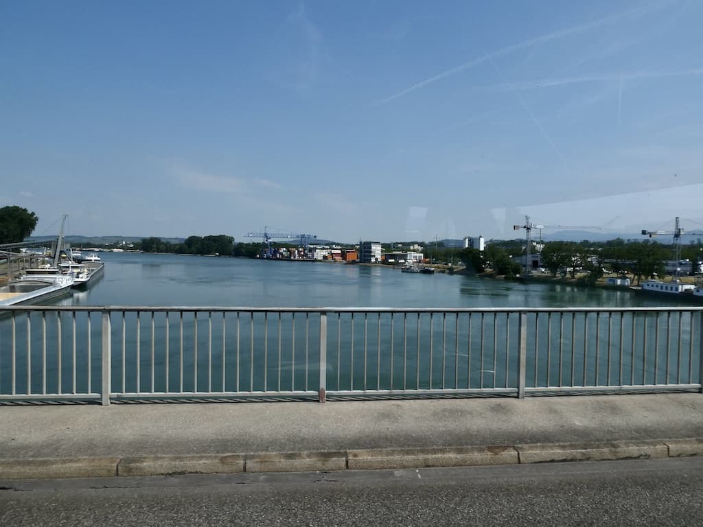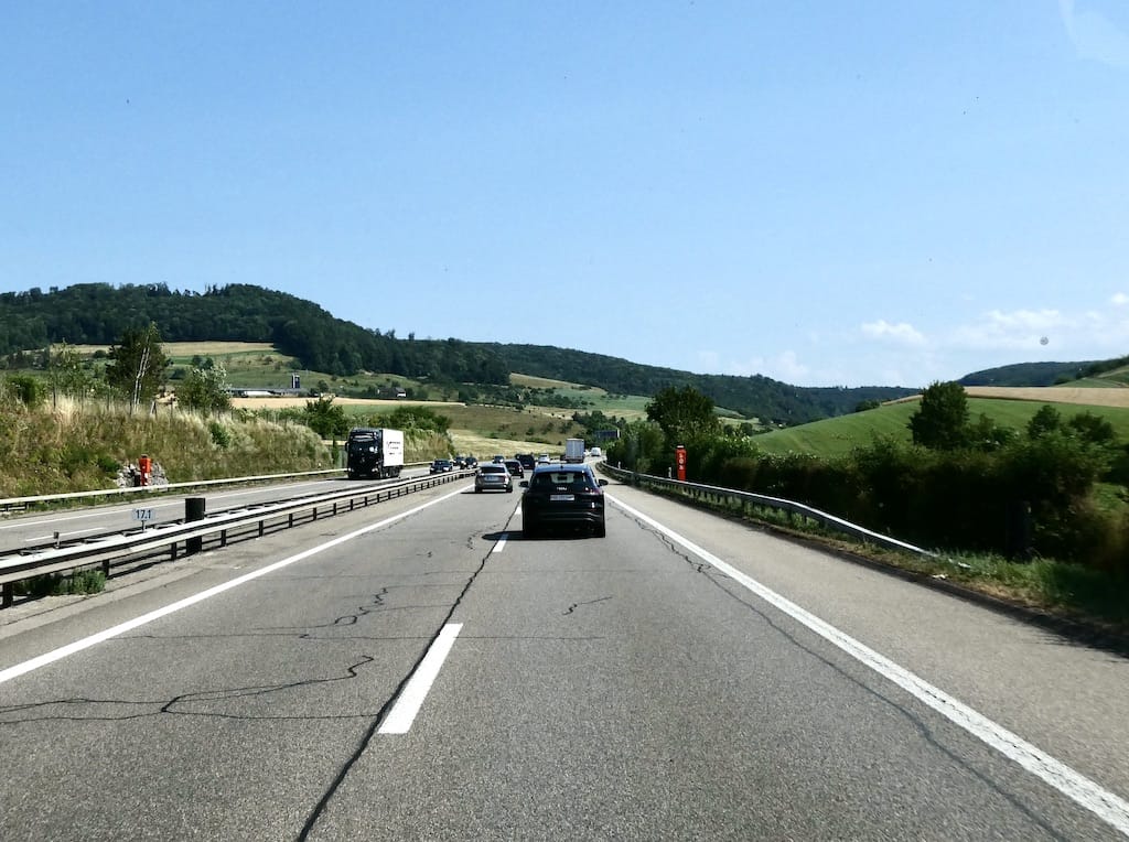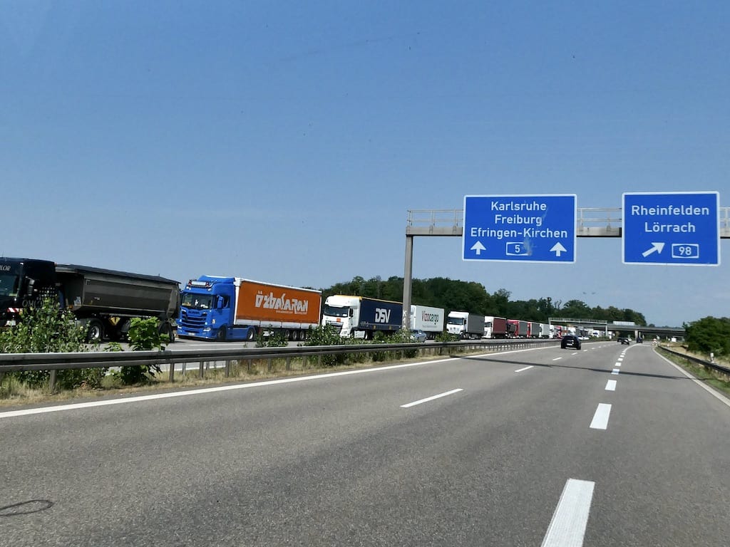 In Saint Luis verlassen wir Frankreich auf der Brücke über den Rhein. Wir müssen in Deutschland ein kurzes Stück auf die A5 fahren, um auf die A98 Richtung Rheinfelden zu kommen. Auf der A5 stehen kilometerlang Lastwagen, die auf die Zollabfertigung in die Schweiz warten müssen. Die Chauffeure sind wirklich nicht zu beneiden, – besonders bei dieser Hitze.