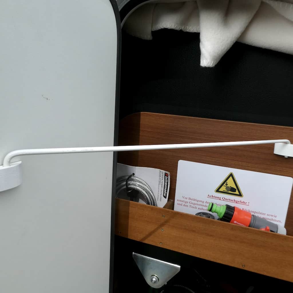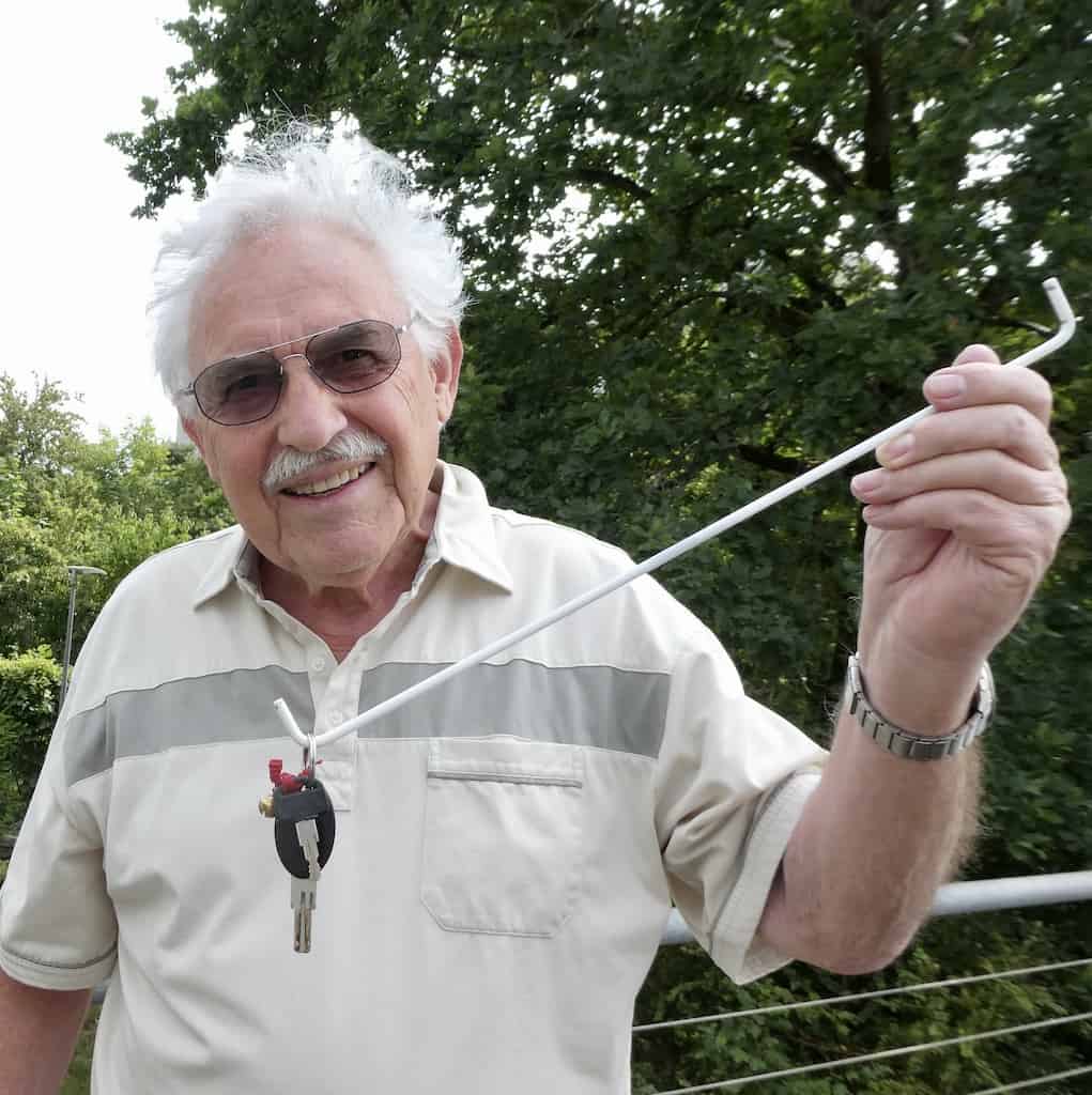 Zum Glück haben wir einen langen Haken dabei, der normalerweise die Garagentür als Sichtschutz beim Aussenduschen offenhält. Der rettet uns aus dieser blöden Situation und Michael kann wieder strahlen. Solche Erfolgserlebnisse braucht der Mann einfach.