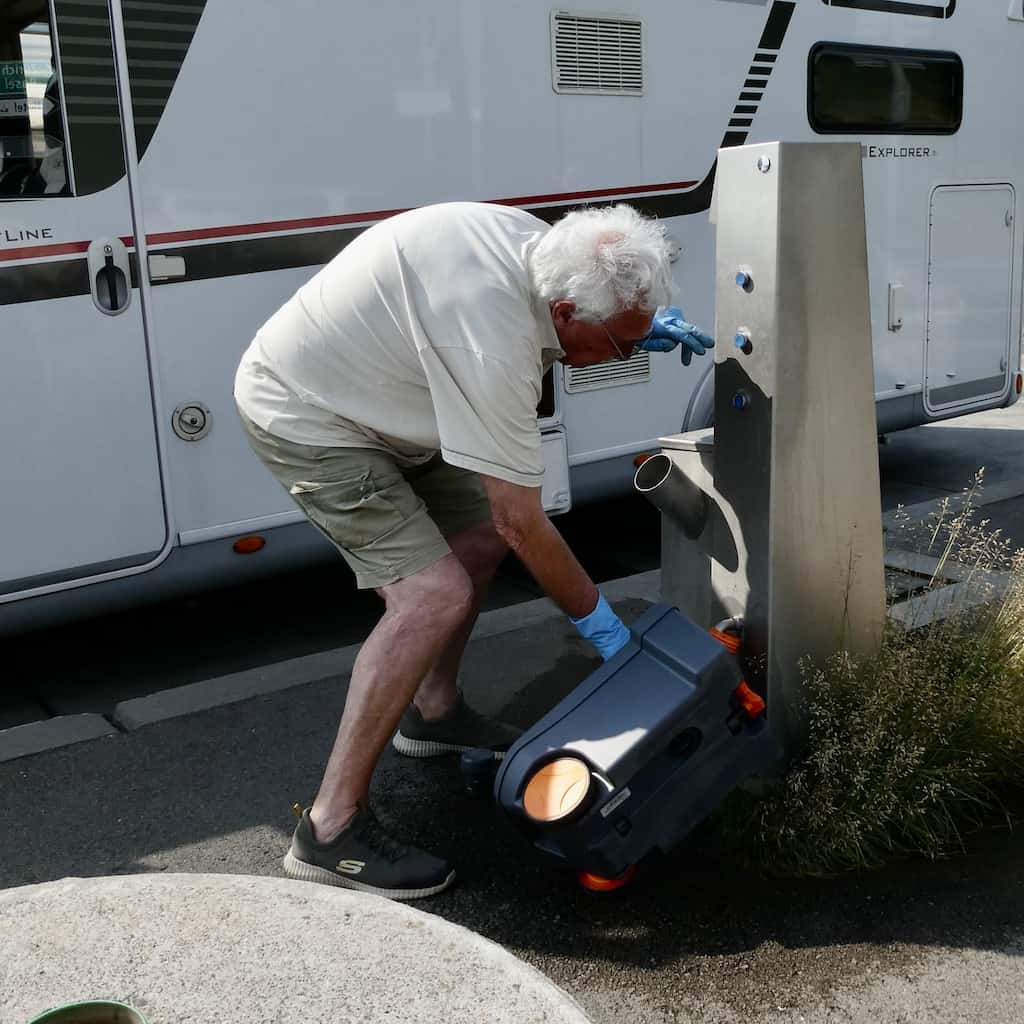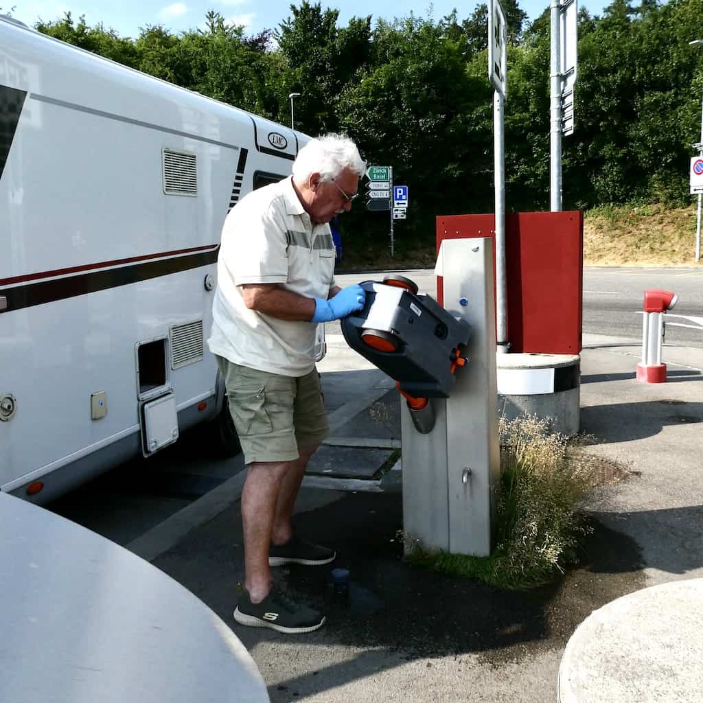 Bei der Raststätte Grauholz, kurz vor Bern, ist unser letzter Stopp zum Leeren von Grauwasser- und Fäkalientank. Das funktioniert auch bestens. Allerdings kommt für das Spülen der Kassette so lange und so viel Wasser, dass eine Überschwemmung nicht zu verhindern ist. Eine unnötige Frischwasservergeudung! Hier wäre dringend ein Service und eine andere Dosierung nötig.