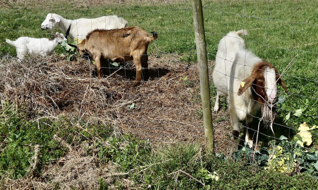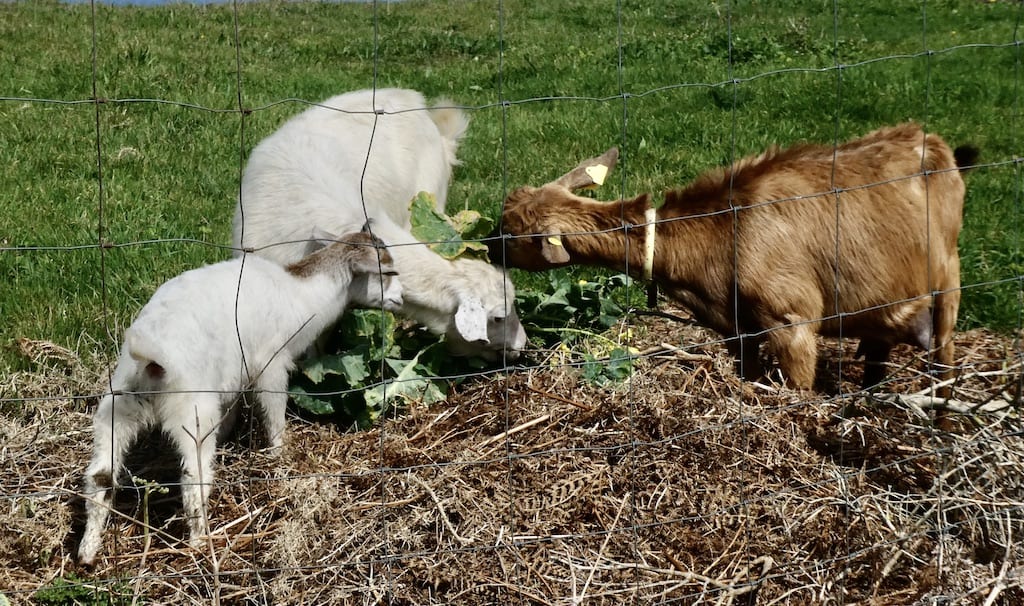 Die Ziegen haben gerade Futter bekommen. Der Bock frisst getrennt vom Rest der Familie.