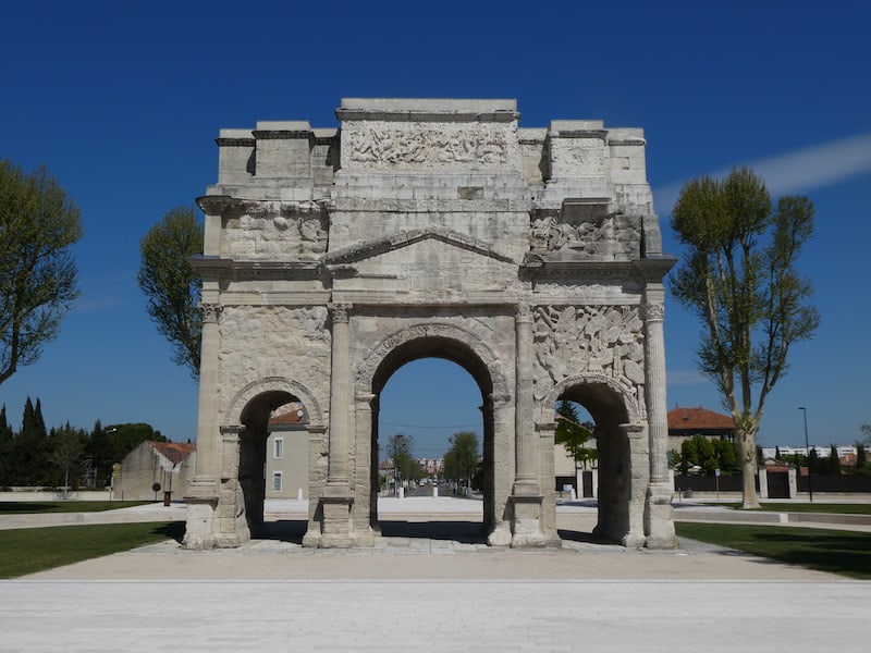 In Orange fahren wir auf den Stadtgründungsbogen zu. Er strahlt förmlich in der Sonne.