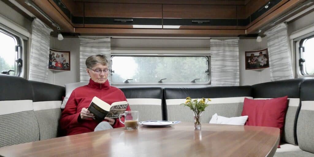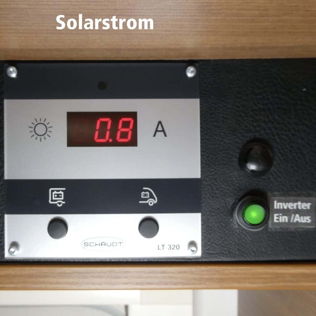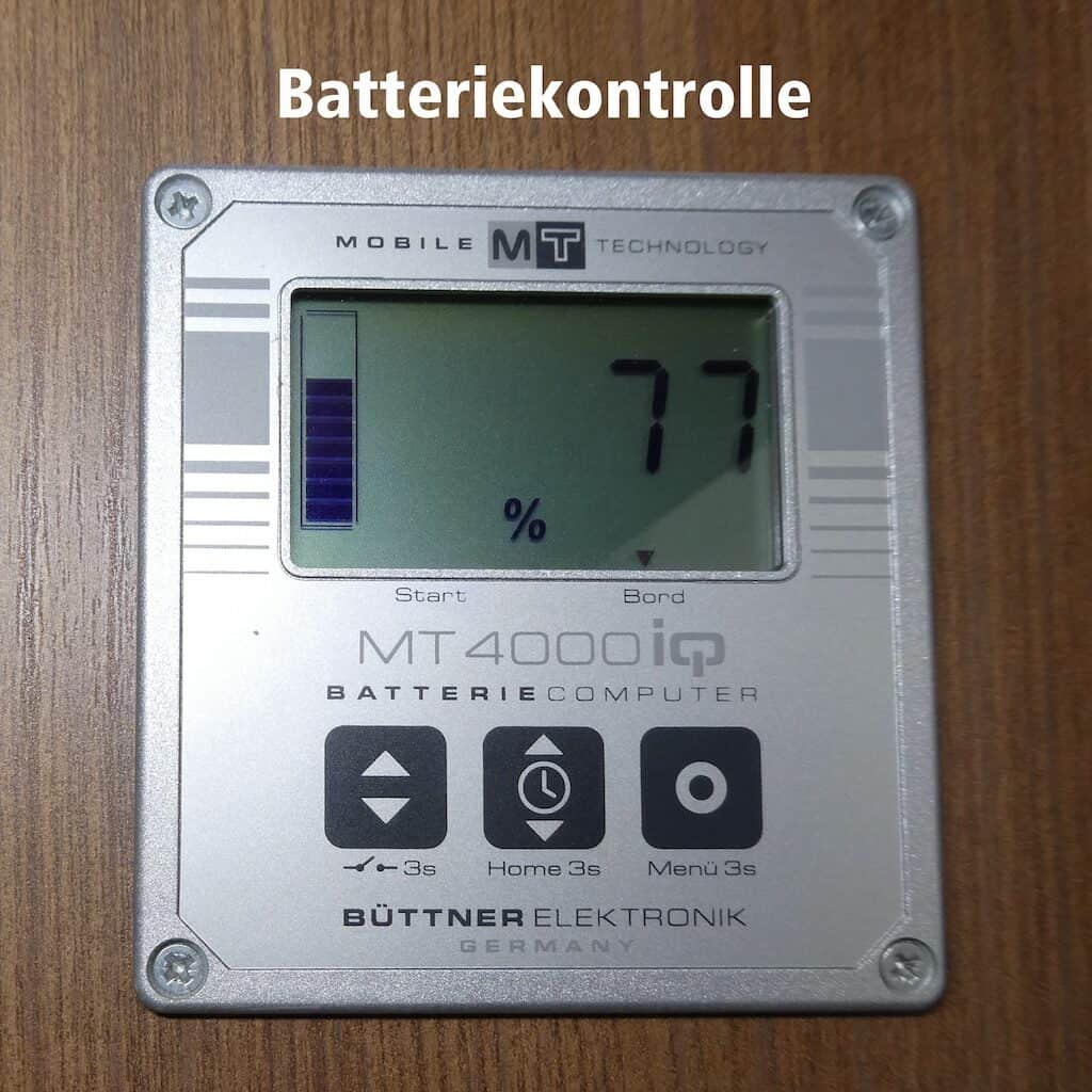 Gas, Frischwasser und Strom reichen auch, wobei die Solaranlage ohne Sonne natürlich praktisch keinen Strom erzeugt, wie schon die letzten Tage. Der BatterieComputer zeigt aber immer noch 77% Restkapazität. Einige Tage können wir unseren zwei Lithiumbatterien also noch Strom entnehmen, auch wenn die Sonne nicht scheint.