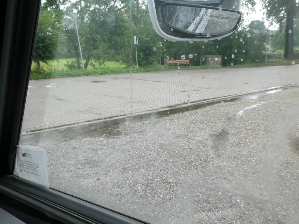 Als der Traum zu Ende ist, regnet es immer noch. So ein richtig schöner Landregen. Gut für die Natur, also auch gut für uns. Und wir könnten zum Abwettern hier auf diesem harten Untergrund nicht besser stehen.