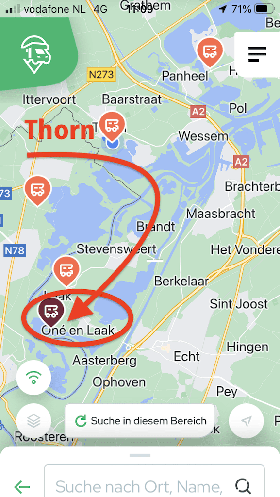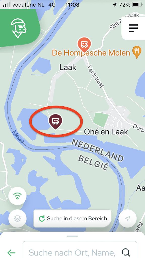 Unser Plan war heute auf einen Stellplatz in Ohé en Laak zu fahren. Der hat in der Stellplatz-App «Campercontact» eine gute Bewertung und liegt sehr schön am Wasser. Allerdings ist dort Wiesen-Untergrund zu erkennen. Und das scheint uns bei diesem feuchten Wetter dann doch nicht so angebracht. So von wegen Einsinken und Festfahren.