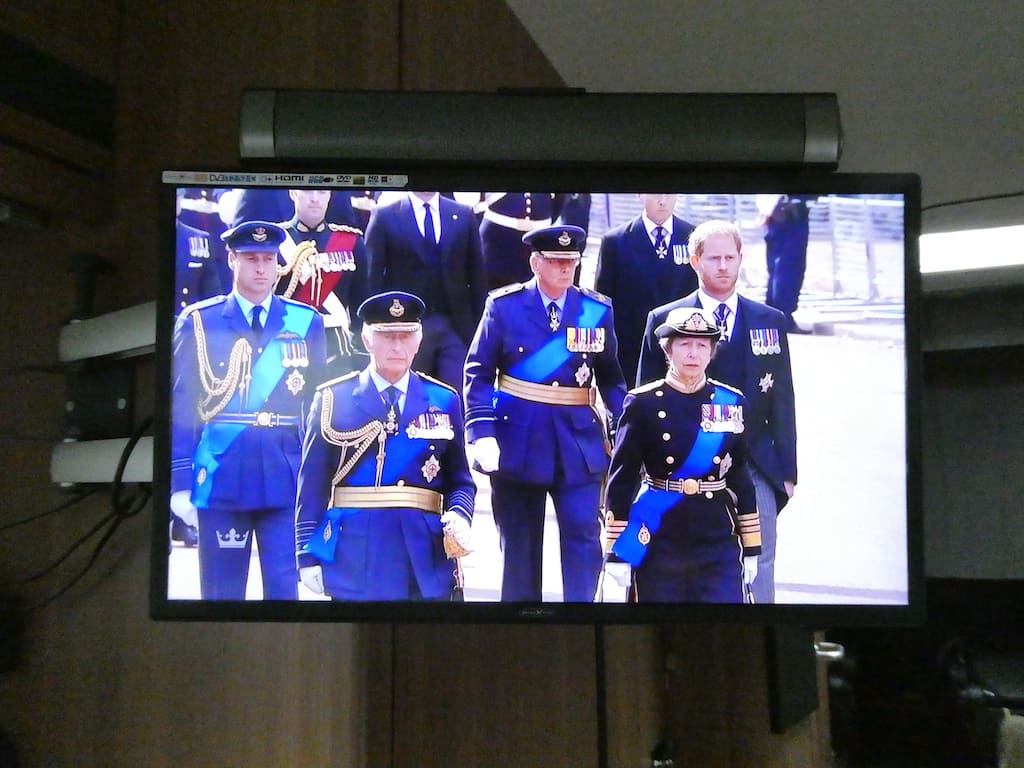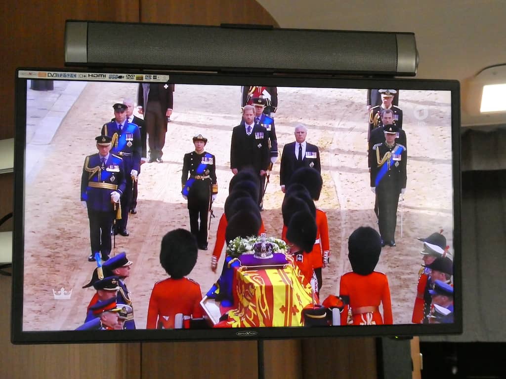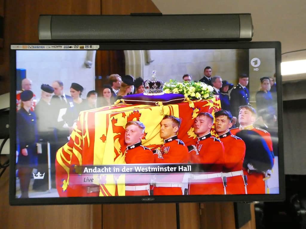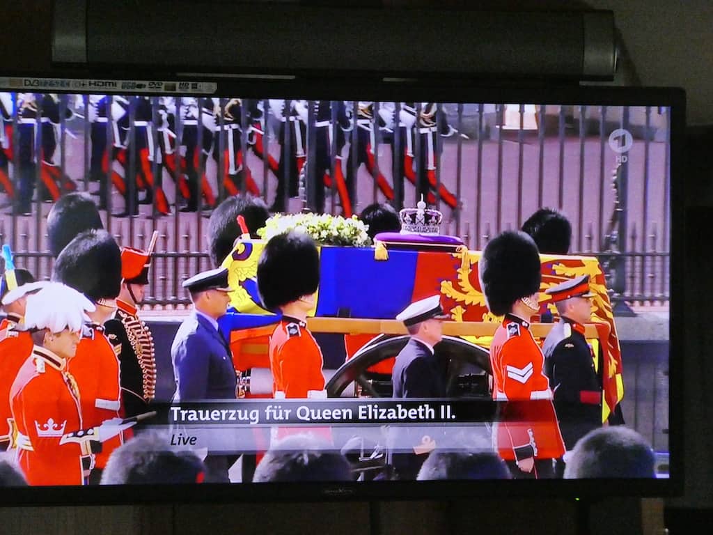 Als hätte Renate es geahnt, läuft gerade die Live-Übertragung aus London der Überführung des Sargs mit der verstorbenen Queen vom Buckingham Palast nach Westminster Hall.